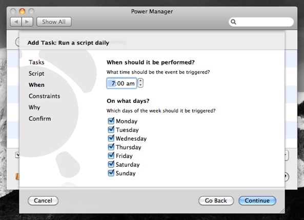 Let’s walk through how to create an event to launch iTunes and to ask it to start playing a song. The event will use a short AppleScript to interact with iTunes. Power Manager will deal with ensuring the AppleScript is performed at the right time; Power Manager will even wake a sleeping Mac beforehand, if needed.