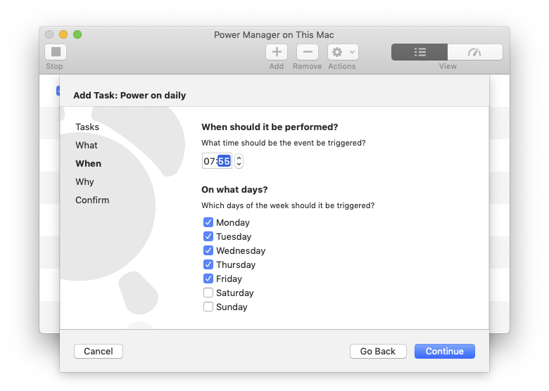 Power Manager includes a Schedule Assistant. The Assistant helps you create events using a series of step by step instructions.