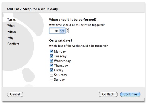 The What step allows us control how long the Mac should sleep for. We want the Mac to sleep for one hour each lunchtime.