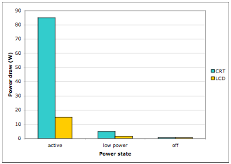 LCD monitors require a fraction of the energy of CRT monitors. The average LCD monitor requires 15W when active, 1.5W in low power mode, and 0.5W when turned off (Kawamoto et al: 2004).